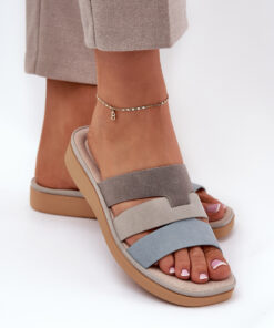 Dames slippers van imitatiesuède zijn een stijlvol en comfortabel voorstel voor warme dagen. Geplaatst op een platform. Drie riempjes aan de voorkant geven ze een modern karakter. De zachte, leren binnenzool met kusseneffect zorgt voor comfort de hele dag door, met aandacht voor het comfort van de voeten. Deze slippers zijn een ideale keuze voor zomerse wandelingen!