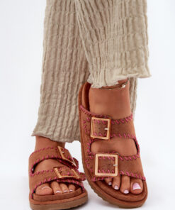 Dames slippers van imitatiesuède, die de aandacht trekken met decoratieve randen en opvallende gespen aan de voorkant. Het draagcomfort wordt gegarandeerd door het gevormde voetbed, dat perfect past bij de vorm van de voet. Dit modieuze model is een geweldige keuze voor zomerse dagen, ideaal voor zowel stedelijke outfits als voor vakanties!