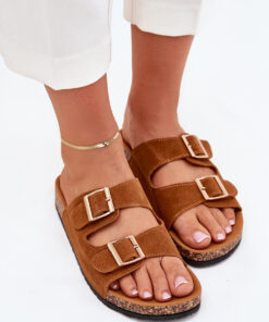 Dames slippers van imitatiesuède, geplaatst op een kurken platform, zijn een combinatie van stijl en comfort. Twee gouden gespen met verstelbare bandjes zorgen voor een perfecte pasvorm aan de voet, en het voorgevormde voetbed zorgt voor comfort gedurende de hele dag. Ideaal voor zomerse outfits, ze passen perfect bij jurken, rokken of shorts.