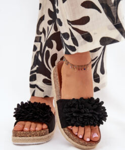 Slippers voor dames perfect voor warme dagen, geplaatst op een kurken platform met vlechtwerk, combineren comfort met zomerse stijl. Aan de voorkant op de band zijn er decoratieve, talrijke stoffen bloemen die charme toevoegen. Het zacht gevormde voetbed van imitatieleer zorgt voor comfort gedurende de hele dag. Uitstekend voor zomerse outfits, ze passen perfect bij jurken, rokken of shorts en zorgen voor lichtheid en frisheid in elke look.