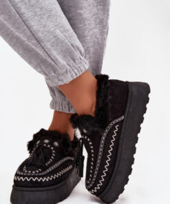 Dames snowboots gemaakt van imitatiesuède zijn een modieus en functioneel voorstel voor de winterdagen. Het model op een platform zorgt voor comfort en uitstekende isolatie tegen het koude oppervlak. De schoenen zijn versierd met opvallende stiksels, bont en franjes, die ze een origineel en stijlvol karakter geven. Dit is de perfecte keuze voor vrouwen die warmte, comfort en een modieuze uitstraling waarderen, ze zullen zich uitstekend lenen voor wandelingen en dagelijkse winterse outfits.