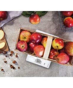Met een hoog draagvermogen van 5 kg en een schaalverdeling van 1 g is de digitale keukenweegschaal Page Compact 300 met marmer look van ideaal voor dagelijks gebruik.Door het moderne design is het een bijzonder pareltje in uw keuken.De natuurlijke marmerlook zorgt voor een stijlvolle sfeer.Bijzonder praktisch is het 12 mm LCD-display, waarop u gemakkelijk de cijfers kunt aflezen.De weegschaal kan gemakkelijk worden bediend met de gepatenteerde Soehnle-sensoraanraking.Uiteraard is de huishoudweegschaal voorzien van een automatische uitschakelfunctie en is daardoor zeer energiezuinig.U kunt de weegfunctie gebruiken om de ingrediënten gemakkelijk te wegen tijdens het bakken of koken in een kom.Om ervoor te zorgen dat de Page Compact 300 stevig staat tijdens het werken, is hij uitgerust met antislipvoetjes.Met zijn extra platte, compacte ontwerp kan hij ook ruimtebesparend worden opgeborgen of met de ophangfunctie aan de muur worden bevestigd.Batterijen zijn al inbegrepen, zodat u de digitale weegschaal direct in gebruik kunt nemen.Deze gaan meer dan twee jaar mee als je het apparaat twee keer per dag gebruikt.Het batterijvak is vastgeschroefd en daardoor kindveilig.