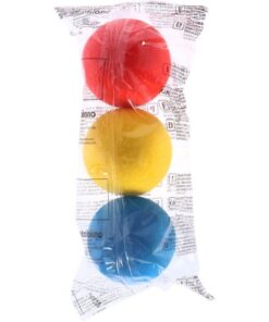 3 softballen van stevig foam, voor gebruik met tennisrackets. In de kleuren rood, geel, en blauw. Geschikt voor kinderen vanaf 3 jaar.
