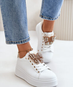 Damessneakers van ecoleder. Staan op een plateau. De schuimrubberen binnenzool zorgt voor je comfort. De belangrijkste troef van dit model is een decoratieve, glanzende vlinder. Geweldig als dagelijkse schoenen, voor naar het werk of naar school.