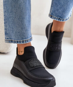 Sportschoenen gemaakt van een combinatie van natuurlijk leer en stof. Staan op een plateau. Aan de binnenkant geïsoleerd met een schoenendeken, waardoor ze perfect zijn voor koudere dagen. Aan de voorkant zit een glimmend element op de band, wat een elegante touch toevoegt.