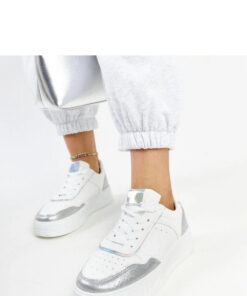 De witte en zilveren sneakers met een dikkere zool van Rumai Adidas zijn de ideale keuze voor iedereen die op zoek is naar trendy schoeisel. Hun afgeronde neus en stijlvolle ontwerp maken ze niet alleen comfortabel, maar ook zeer visueel aantrekkelijk. Gemaakt van rubber, bieden ze duurzaamheid en draagcomfort. De schoenen met veters en een gemiddelde hakhoogte passen perfect bij veel outfits, zodat je altijd in de mode bent.