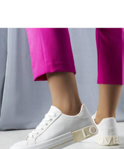 Wit-beige sneakers versierd met de tekst Nora zijn een ideale keuze voor alle liefhebbers van een casual stijl. De sneakers hebben een vetersluiting, zodat je ze kunt aanpassen aan je voet. Ze zijn gemaakt van hoogwaardige materialen en de zool is gemaakt van wit rubber. Ze zijn perfect voor dagelijks gebruik, maar ook voor weekendwandelingen of ontmoetingen met vrienden. Sneakers uit de zomercollectie die karakter zullen toevoegen aan elke outfit.
