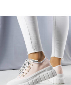 Roze sneakers op het platform Toni zijn een ideale keuze voor liefhebbers van streetwearstijl. Gemaakt van hoogwaardige stof, ze hebben een comfortabele inlegzool van textiel en zijn versierd met delicate stiksels op de enkelhoge schacht. De sneakers hebben ook een rubberen inzetstuk op de neus en een dikke zool versierd met verticale groeven. De platte, gelabelde vetersluiting zorgt voor extra draagcomfort. Ze passen perfect bij trendy jeans en een oversized trui. De standaard maatvoering, dus het is raadzaam om uw eigen maat te kiezen bij de aankoop. De platform sneakers Toni zijn ideaal voor de zomer, ze hebben geen voering en het witte rubber op de zool geeft ze een extra effect.