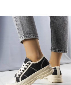 Zwarte platform sneakers Nichole zijn een ideale keuze voor liefhebbers van stedelijke stijl. De sneakers hebben een modieuze, dikkere platform met smalle groeven en een rubberen neus. De schacht reikt tot voor de enkel en de schoenen zijn vastgebonden met platte veters. Gemaakt van hoogwaardig textielmateriaal zorgen ze voor comfort en stijl. Sneakers op een decoratieve platform zijn een geweldige aanvulling op stedelijke outfits – ze passen perfect bij boyfriend jeans, joggers of wijde shorts. De maatvoering is standaard, dus het is aan te raden om je eigen maat te kiezen bij aankoop. De sneakers hebben een beige rubberen zool, wat ze extra charme geeft. Een uitstekend voorstel voor de zomer!