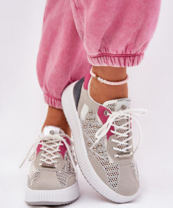 Damessneakers gemaakt van een combinatie van eco-suède en mesh, wat zorgt voor lichtheid, ademend vermogen en tegelijkertijd een modieuze uitstraling. Aan de zijkant van de schacht bevinden zich studs die hen een uniek karakter geven. Binnenin bevindt zich een zachte schuimrubberen inlegzool, bedekt met materiaal, die comfort en demping biedt tijdens het lopen. Ideaal voor dagelijkse styling, deze schoenen combineren functionaliteit met een modieuze touch, perfect voor zowel actieve als casual outfits.