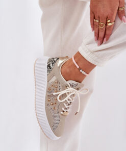 Dames sportschoenen gemaakt van een combinatie van eco-suède en mesh, wat zorgt voor lichtheid, ademend vermogen en tegelijkertijd een modieuze uitstraling. Aan de zijkant van de schacht bevinden zich studs die ze een uniek karakter geven. Binnenin bevindt zich een zachte schuimrubberen inlegzool, bedekt met materiaal, die comfort en demping tijdens het lopen biedt. Ideaal voor dagelijkse styling, deze schoenen combineren functionaliteit met een modieus accent, perfect voor actieve en casual outfits.
