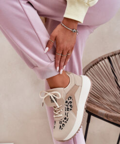 Stijlvolle damessportschoenen gemaakt van imitatiesuède. Geplaatst op een platform. De voorkant van de schoenen is versierd met omgeslagen materiaal met een tekst die ze een uniek karakter geeft. Deze sportschoenen passen perfect bij casual outfits, bieden comfort en een modieus accent voor dagelijks gebruik. Ideaal voor wandelingen of activiteiten, ze zijn een uitstekende keuze voor verschillende gelegenheden.