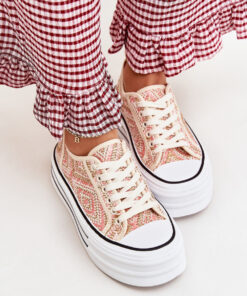 Sneakers voor dames op een stevige platformzool van rubbermateriaal zijn een modieuze en comfortabele keuze voor dagelijks gebruik. Laag, klassiek vetersluiting zorgt voor comfort en een uitstekende pasvorm. Brede, ronde neuzen geven extra ruimte, en het zachte voetbed garandeert comfort gedurende de hele dag. Ideaal voor dagelijkse stijlen, combineren ze functionaliteit met een moderne uitstraling.