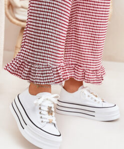 Dames sneakers van textielmateriaal op een stevige platform zijn een modieuze keuze voor dagelijks gebruik. Ze zijn vetersluiting met extra gouden details die een stijlvol accent geven. Ideaal voor casual outfits, ze combineren comfort met een moderne uitstraling en passen perfect bij zowel broeken als jurken.