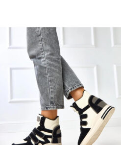 Moderne damessportschoenen gemaakt van hoogwaardig ecologisch leer, die comfort combineren met een trendy design. Het model heeft een ronde neus, klassieke vetersluiting en extra klittenbandstrips die de voet stabiliseren en de schoenen een uniek karakter geven. De verborgen 5,5 centimeter hoge sleehak tilt subtiel de silhouet op, terwijl de hoge enkelkraag stabiliteit en comfort biedt tijdens het dragen. Het interieur is afgewerkt met stof, wat zorgt voor ventilatie en comfort gedurende de hele dag. Dit stijlvolle en functionele sportieve schoeisel is ideaal voor dagelijkse, stedelijke outfits met een vleugje sportieve elegantie.