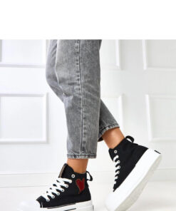 Stijlvolle lage damessneakers, gemaakt van ademende stof, die comfort en trendy design combineren. De klassieke, ronde neus en vetersluiting zorgen voor comfort en een perfecte pasvorm. Het model op een platform van 4,5 cm hoog voegt subtiele hoogte toe en een moderne uitstraling. De decoratieve hartvormige print aan de zijkant van de schoen benadrukt de vrouwelijke en originele stijl van het schoeisel. Ideaal voor dagelijks gebruik in sportieve en casual outfits.