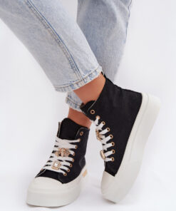 Dames sneakers op een stevige platform zijn een modieuze keuze voor liefhebbers van een opvallende stijl. De dikke zool geeft de schoenen een modern karakter en zorgt voor comfort tijdens het dragen, terwijl het gouden element een opvallend accent vormt. Het model met vetersluiting zorgt voor een goede pasvorm rond de voet, en de decoratieve details voegen originaliteit en een modieuze uitstraling toe. Deze sneakers zullen perfect passen bij dagelijkse outfits.