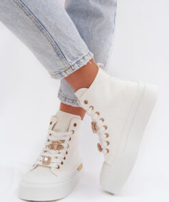 Sneakers voor dames op een stevige platform zijn een modieuze keuze voor liefhebbers van een uitgesproken stijl. De dikke zool geeft de schoenen een moderne uitstraling en zorgt voor draagcomfort, terwijl het gouden element de aandacht trekt. Het model met vetersluiting zorgt voor een goede pasvorm en de decoratieve details voegen originaliteit en een modieuze uitstraling toe. Deze sneakers zijn perfect voor dagelijkse outfits.
