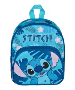 Blauwe rugzak met roze accenten. Voorop staat een afbeelding van Stitch. Met hoofdvak en zijvak, beide met ritssluiting. Afmeting: 30,5 bij 25,5 bij 10 centimeter. Geschikt voor kinderen vanaf 3 jaar oud.