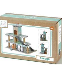 Mooie houten Studio Circus garage met meerdere verdiepingen. De garage heeft3 verdiepingen met hellingen, een autolift met een opwindmechanisme, een helikopterplatform, een benzinepomp en een wasstraat met twee wasrollen. Bij de garage horen 3 pastelkleurige voertuigen, een helikopter, een politieauto en een ambulance. Afmeting ca. 37 x 30 x 45 cm. Geschikt voor kinderen vanaf 24 maanden.