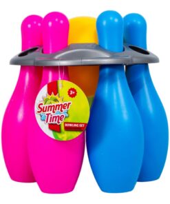 Summertime bowling set, bestaande uit 6 kegels in de kleuren roze, blauw, groen en een gele bal. Voorzien van handig opbergframe.