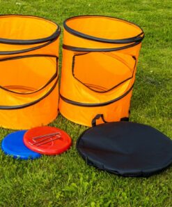 Frisbeeën wordt nu nog leuker! Bij deze set zitten namelijk twee emmers, die je als target kunt gebruiken. Je zet ze ongeveer 15 meter uit elkaar, bijvoorbeeld op een grasveld of op het strand. Je kunt ze extra stevig in de grond plaatsen met de bijgeleverde haringen. Je kunt dit spel met 2 of 4 personen spelen. Het is de bedoeling, om de frisbee zo goed mogelijk richting de emmer te gooien. Als ‘ie de emmer aanraakt krijg je 2 punten. Landt de frisbee in de emmer, krijg je 5 punten! Bij het spel met 4 spelers komt er een extra dimensie bij: dan mag jouw teamlid helpen om de frisbee in de juiste richting te sturen. Wie het eerste 21 punten heeft verzameld, wint het spel. Inhoud: twee oranje pop-up emmers, een rode frisbee, een blauwe frisbee en zes haringen. Je kunt de set opruimen in de handige draagtas. Geschikt voor kinderen vanaf 5 jaar.