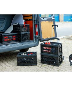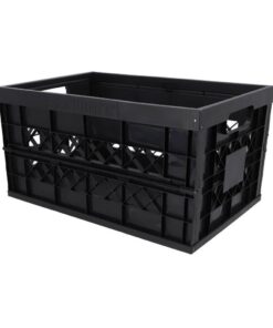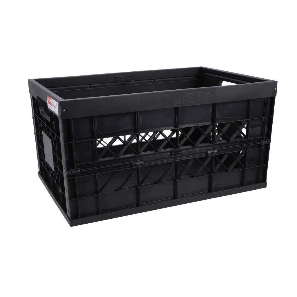 De zwarte Sunware Heavy Duty vouwkrat heeft een draagkracht van 45 liter en een extra versteviging dankzij zijn metalen pennen in de hoeken. Met open handvaten en is inklapbaar.
