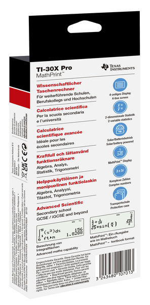 Wetenschappelijke calculator en geschikt voor het havo- en vwo-eindexamen. Modern ontwerp. Hoge resolutie display voor betere leesbaarheid. Invoer / uitvoer zoals in het wiskundeboek. TI-typische bedieningslogica (vergemakkelijkt latere migratie naar TI-Nspire CX). Uitgebreide functies. Breed scala aan regressiemodellen. Statistieken met een en twee variabelen. Kies tussen de getalnotaties graden / radialen, zwevend punt / vast. Kies uit drie oplossingsfuncties: numerieke vergelijking, polynoom en systeem van lineaire vergelijkingen. Toon een gedefinieerde functie in tabelvorm. Bepaal de numerieke afgeleide en de integraal voor echte functies. Voer vector- en matrixberekeningen uit in een vector- en matrixinvoervenster. regressiemodel voor natuurlijke exponentiële functies (e ^ x). weergave van twee functies in de waardetabel. Constant geheugen; er is geen invoer verloren. Eenvoudige bediening; maximale 2-voudige bezetting. Ideaal voor de school. hogere testbeveiliging via het display van het besturingssysteem. Cross-school type geschikt voor de middelbare school I en II. Toegekend aan het International Baccalaureate (IQB)