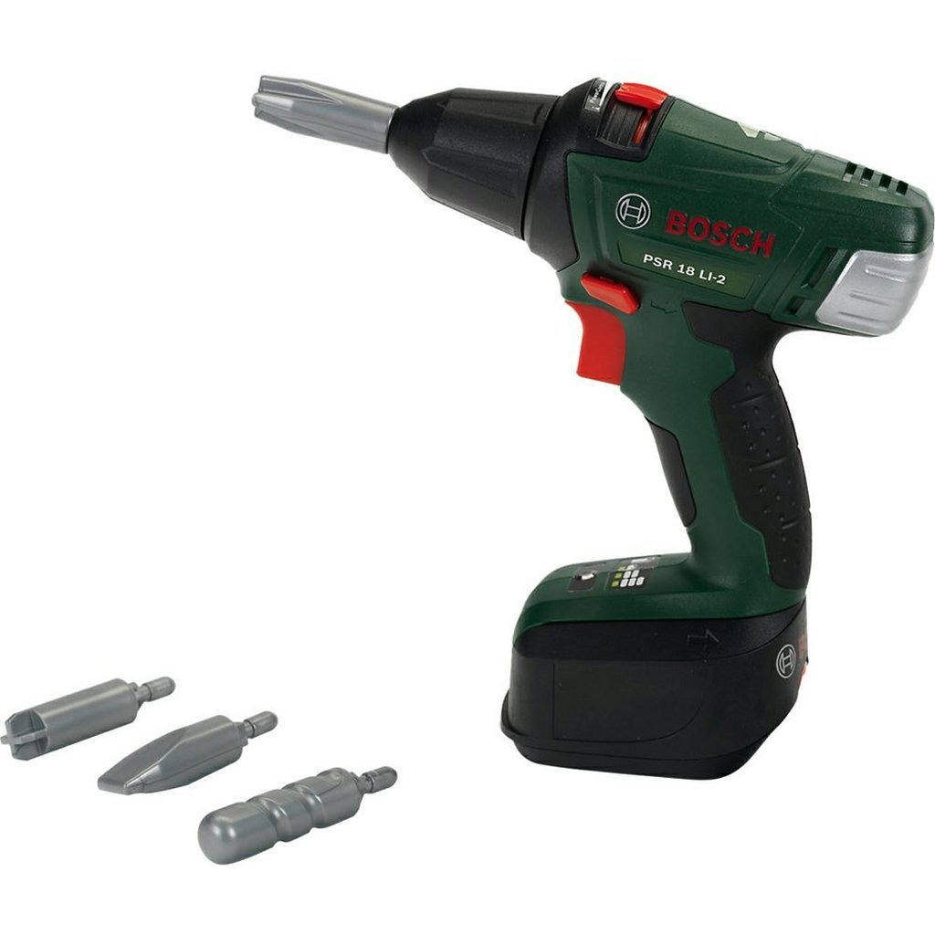 Accuschroevendraaier van Bosch die net echt lijkt. Heeft draaiende en verwisselbare boor/schroever, rechts- en linksloop met realistisch boor- en schroefgeluid en licht. Batterijen: 3x AA, niet inbegrepen.