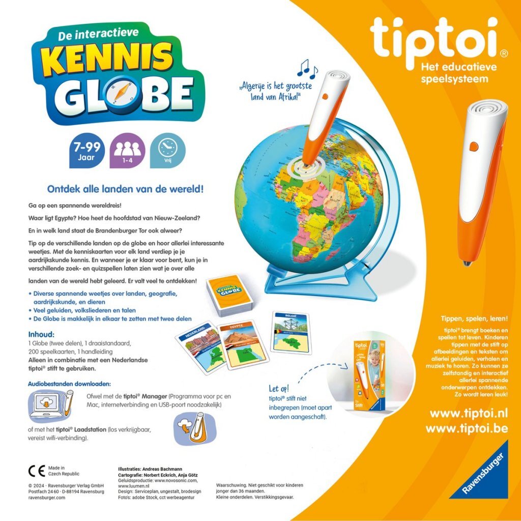De Tiptoi Interactieve Kennis Globelaat kinderen de wereld ontdekken via geluiden, feiten en spelletjes. Met de Tiptoi-stift leren ze over landen, continenten, culturen en natuurverschijnselen. Geschikt voor kinderen vanaf 6 jaar, perfect voor nieuwsgierige wereldontdekkers!