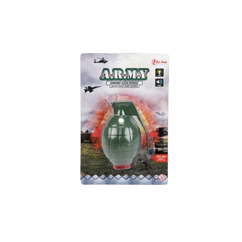 Toi-Toys handgranaat met licht- en geluidseffecten. Batterijen 5x (AG10) inbegrepen. Verkrijgbaar in verschillende uitvoeringen. U kunt niet kiezen, maar ontvangt een willekeurige uitvoering.