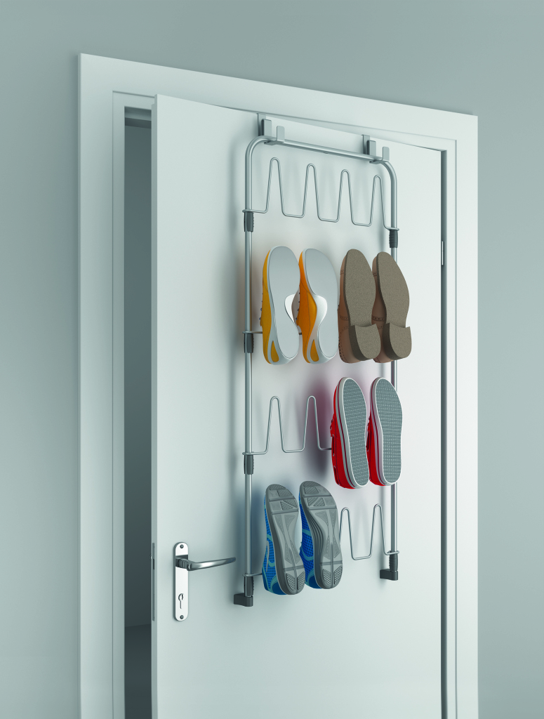 De Shoes@door is een handig en ruimtebesparend rek dat aan elke deur met een dikte tussen de 2 en 4 cm gehangen kan worden. De afmetingen van dit rek zijn 45x17x103 cm. Geschikt voor 8 paar schoenen.