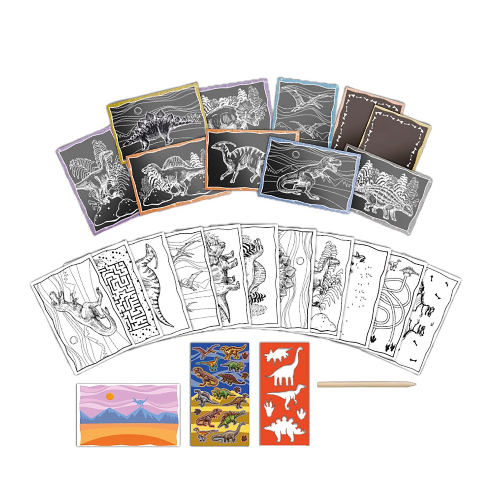 Maak 10 metallic dinosaurus kraskaarten inclusief stickers, achtergrond, kleurplaten en kraspen. Geschikt voor kinderen vanaf 3 jaar.