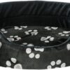 De Trixie Mand Jimmy Ovaal Zwart Met Pootprint 55 x 45 cm is een zachte hondenmand met opstaande rand en lage instap, met schuimrubber vulling, wendbaar kussen en slipvaste onderkant. Deze mand biedt jouw hond een fijne plek om in weg te kruipen. Mand Jimmy heeft een opstaande rand met schuimrubber vulling, bekleed met zacht pluche voor meer comfort en een veilig gevoel. De lage instap zorgt ervoor dat ook honden die kleiner zijn of slecht ter been zijn gemakkelijk de mand in kunnen stappen. De mand is voorzien van een wendbaar kussen en een slipvaste onderkant. Hierdoor wordt voorkomen dat de mand verschuift bij het in- en uitstappen.