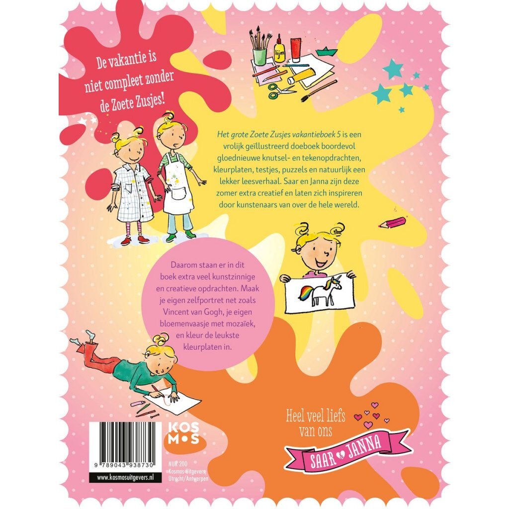 De vakantie is niet compleet zonder de Zoete Zusjes! ‘Het grote Zoete Zusjes vakantieboek 5’ van Hanneke de Zoete is een vrolijk geĆÆllustreerd doeboek boordevol gloednieuwe knutsel- en tekenopdrachten, kleurplaten, testjes, puzzels en natuurlijk een lekker leesverhaal. Saar en Janna zijn deze zomer extra creatief en laten zich inspireren door kunstenaars van over de hele wereld. Daarom staan er in dit boek extra veel kunstzinnige en creatieve opdrachten. Maak je eigen zelfportret net zoals Vincent van Gogh, je eigen bloemenvaasje met mozaĆÆek, en kleur de leukste kleurplaten in.