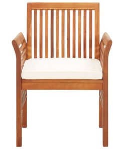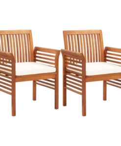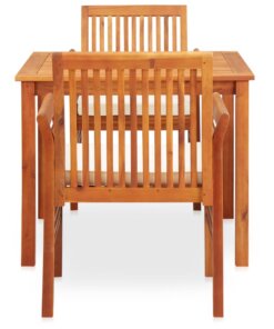 De tafel en stoelen zijn gemaakt van massief acaciahout met een olieafwerking en hebben een lattenontwerp, waardoor de set weerbestendig is en geschikt is voor buitengebruik. Het met olie afgewerkte oppervlak is gemakkelijk schoon te maken. Dankzij de comfortabele schuimkussentjes kan je heerlijk buiten ontspannen. Wanneer de set niet in gebruik is, wordt aangeraden om hem af te dekken of op te bergen om de levensduur te verlengen.