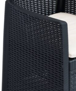 De rattan-look tuinset is gemaakt van massief kunststof, waardoor hij duurzaam, sterk en weerbestendig is. Bovendien is hij gemakkelijk schoon te maken. Zijn rattan-look ontwerp voegt een vleugje natuurlijke charme toe aan je leefruimte buiten. De tuinset is ook lichtgewicht en daardoor gemakkelijk te verplaatsen. De tuintafel en stoelen zijn eenvoudig te monteren.