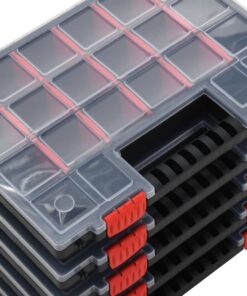 - Transparant deksel: dankzij het transparante deksel kan je de inhoud bekijken. Zo kan je bouten, moeren, spijkers en andere kleine onderdelen gemakkelijk herkennen en vinden.