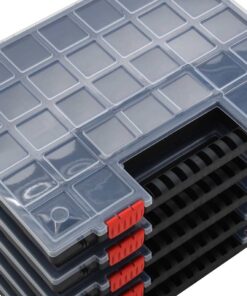 - Transparant deksel: dankzij het transparante deksel kan je de inhoud bekijken. Zo kan je bouten, moeren, spijkers en andere kleine onderdelen gemakkelijk herkennen en vinden.