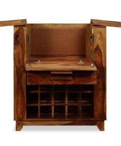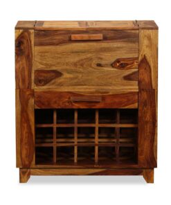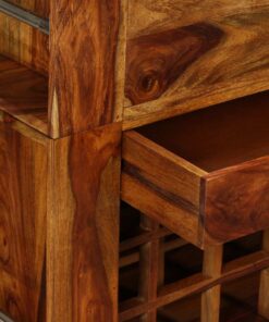 Onze massief houten huisbar heeft een wijnrek, een lade, handige schappen aan de zijkant en een groot bovengedeelte dat ook dienst doet als serveerblad wanneer hij is geopend. Het is een ideale oplossing om flessen wijn en likeur, glazen en andere spullen netjes opgeborgen te houden. Dankzij het rustieke ontwerp is deze stijlvolle barkast is ook een tijdloze aanvulling op je interieur.