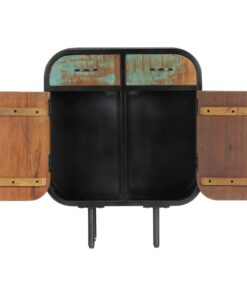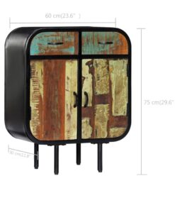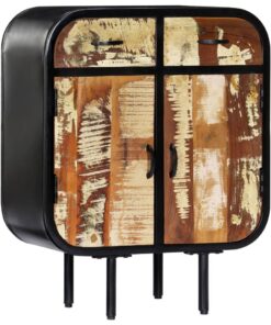 De houten kast is gemaakt van massief hergebruikt hout dat afkomstig is van planken, vloeren en steunbalken van oude, afgebroken gebouwen en kan bestaan uit verschillende houtsoorten, zoals grenen, teak, beuken, eiken, ceder, mangohout en acacia. Dit betekent dat het hergebruikte hout de kenmerken van deze verschillende houtsoorten behoudt. Het hout is al verouderd, verweerd en gedroogd, dus het krimpt en buigt niet. De opbergkast is handgemaakt en het prachtige vakmanschap draagt bij aan de spectaculaire retro stijl. Elke stap van het proces wordt met de grootste zorg uitgevoerd, of het nu polijsten, verven of lakken is. Daarnaast draagt het gepoedercoat ijzeren frame bij aan de stabiele en stevige structuur en geeft het de kast een industriële stijl.