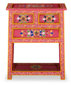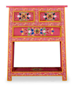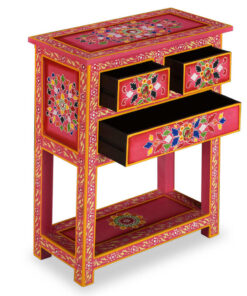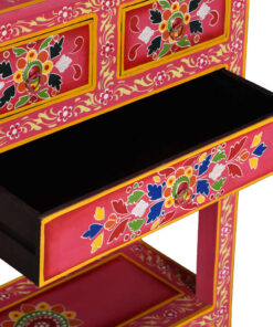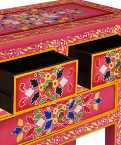 Het dressoir is handgemaakt van mangohout, dat zowel duurzaam als mooi is. Het vakmanschap draagt bij aan de spectaculaire retrostijl. Elke stap van het proces wordt met de grootste zorg uitgevoerd, of het nu gaat om polijsten, schilderen of lakken. Het meubel heeft uitgebreide, met de hand geschilderde decoratieve details, waardoor een warm en rijk effect ontstaat.