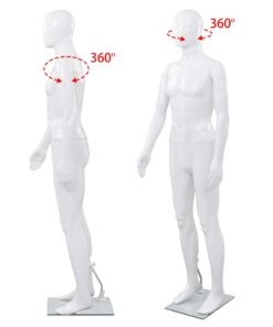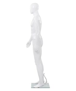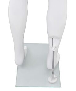 De mannequin bestaat uit 5 delen: hoofd, romp, benen, linkerarm en rechterarm. Het hoofd en de armen kunnen 360° worden gedraaid, waardoor je de etalagepop in verschillende posities kunt plaatsen. Het lichaam is gemaakt van polypropyleen wat licht is in gewicht en duurzaam. De glazen voet met aluminium standaard zorgt voor stabiliteit en dat het model schoenen kan dragen.