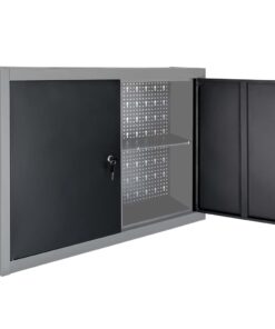 Deze gereedschapsopberger is voorzien van twee in hoogte verstelbare schappen en een geperforeerde plaat met Euro-gaten die kan worden gebruikt voor het ophangen van verschillende soorten gereedschappen, zoals sleutels, tangen, hamers, enz. De gereedschapskast is uitgerust met 2 afsluitbare deuren (inclusief 2 sleutels voor elke deur) en biedt dus extra veiligheid. De kast is gemaakt van metaal met een extra sterke, krasbestendige coating, waardoor hij duurzaam en gemakkelijk schoon te maken is. Dit product moet gemonteerd worden.