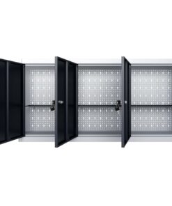 Deze gereedschapsopberger is voorzien van drie in hoogte verstelbare schappen en een geperforeerde plaat met Euro-gaten die kan worden gebruikt voor het ophangen van verschillende soorten gereedschappen, zoals sleutels, tangen, hamers, enz. De gereedschapskast is uitgerust met 3 afsluitbare deuren (inclusief 2 sleutels voor elke deur) en biedt dus extra veiligheid. De kast is gemaakt van metaal met een extra sterke, krasbestendige coating, waardoor hij duurzaam en gemakkelijk schoon te maken is. Dit product moet gemonteerd worden.