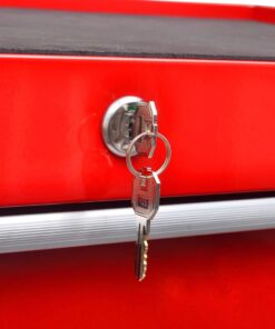 Dankzij het geïntegreerde slot kunnen alle lades tegelijkertijd worden vergrendeld, waardoor voorkomen wordt dat ze per ongeluk kunnen openen wanneer de trolley wordt verplaatst. Twee van de zwenkwielen hebben remmen. De robuuste bovenkant van de gereedschapstrolley is een geweldige plek om gereedschap binnen handbereik te houden. Er zit ook een handig handvat aan de zijkant om de gereedschapswagen te kunnen duwen.