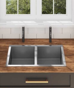 Deze gootsteen combineert het beste van functie en design. De dubbele gootsteen is gemaakt van hoogwaardig, handgemaakt roestvrij staal met verfafwerking waardoor hij anti-condensatie, schimmelbestendig, loodvrij en roestbestendig is. Hij is geluidsarm dankzij de geluiddempende pads. Bovendien heeft de bak een uniek X-flume-ontwerp, om een snelle stroming te faciliteren en stilstaand water op de bodem van het bassin te voorkomen.