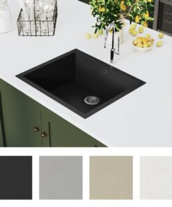 De wastafel is gemaakt van graniet waardoor hij hittebestendig, kras- en slagvast en gemakkelijk schoon te maken is. Een zeefje is ook inbegrepen voor eenvoudige verwijdering van vuil. Het afvoergat heeft een diameter van 90 mm.