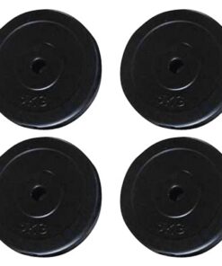 De gewichtsschijven van 10 kg zijn bedekt met kunststof, terwijl de gewichten van 5 kg gevuld zijn met zand en bedekt zijn met robuust, vloervriendelijk rubber.