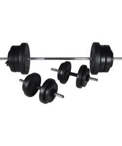 De halterset bestaat uit massief verchroomde stangen met snelwerkende veersluitingen (voor lange halterstang), anti-slip gekartelde handgrepen en gegroefde schroefdoppen (voor halterstang) voor stevige bevestiging van de gewichtsschijven. Je kan trainen zonder dat je je zorgen hoeft te maken over veiligheidskwesties. De gewichten zijn gemaakt van een robuuste polyethyleen behuizing. Ze kunnen op verschillende manieren worden gecombineerd voor verschillende trainingsdoeleinden.